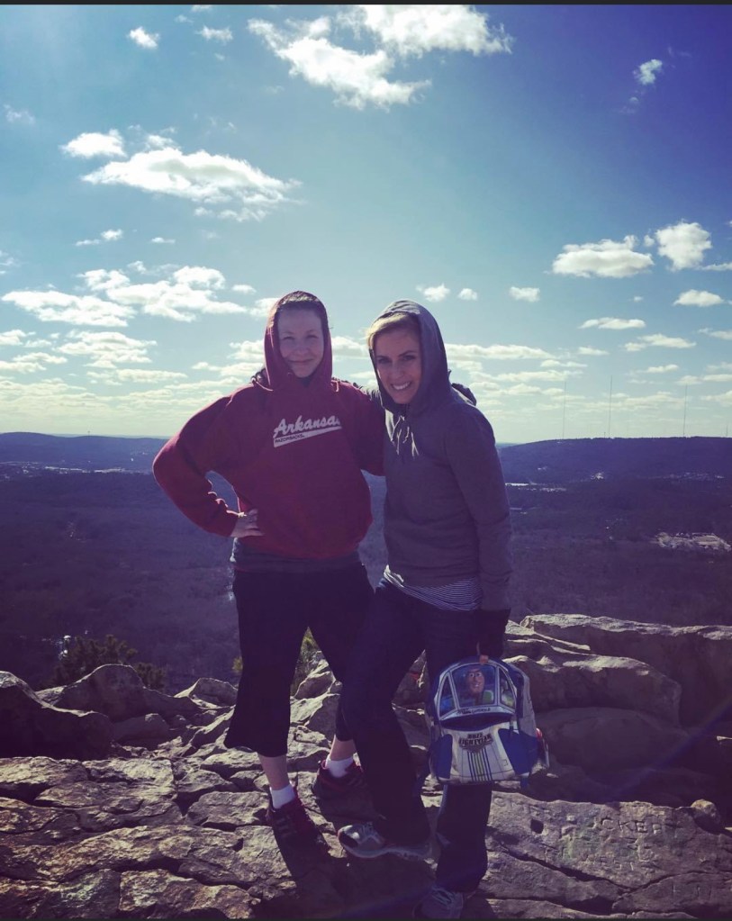As Cindy and I set out that morning, we dressed in layers. It was February, after all. I donned my vintage Arkansas Razorbacks hoodie for good vibes. Cindy wore a gray hoodie that bore no team loyalty. I forgave her for that since she was a good friend. We packed some water and snacks in the only bag we had laying around of appropriate size, a small Buzz Lightyear backpack that one of the boys had used at preschool. We made the 30-minute drive to the parking area at the base of the mountain and set out for a morning of adventure.